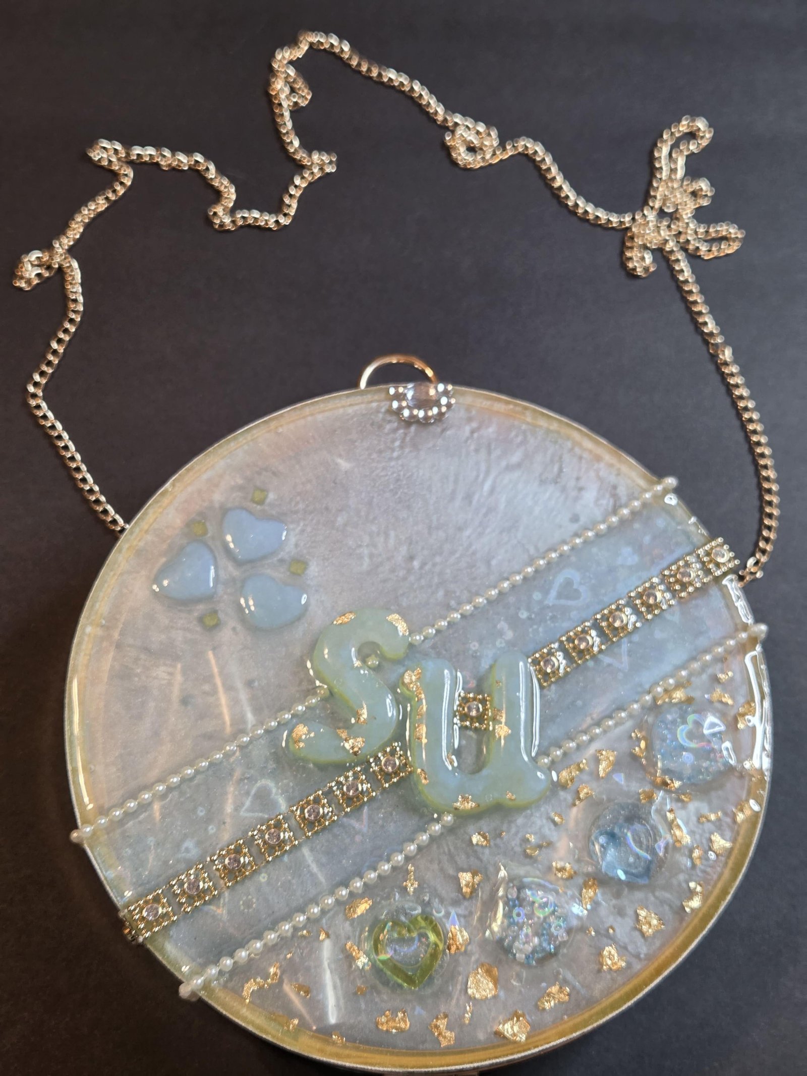 Unique handmade featuring a shimmering, pearlescent surface with an embossed, textured design on one side and decorative embellishments on the other.