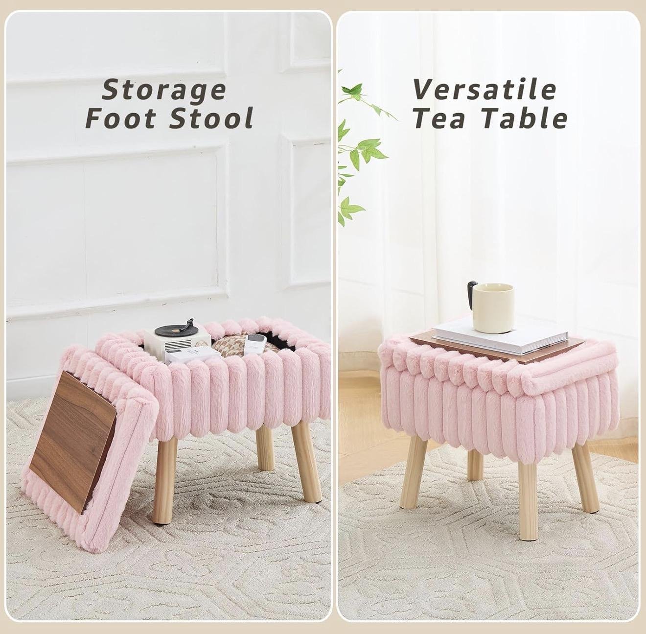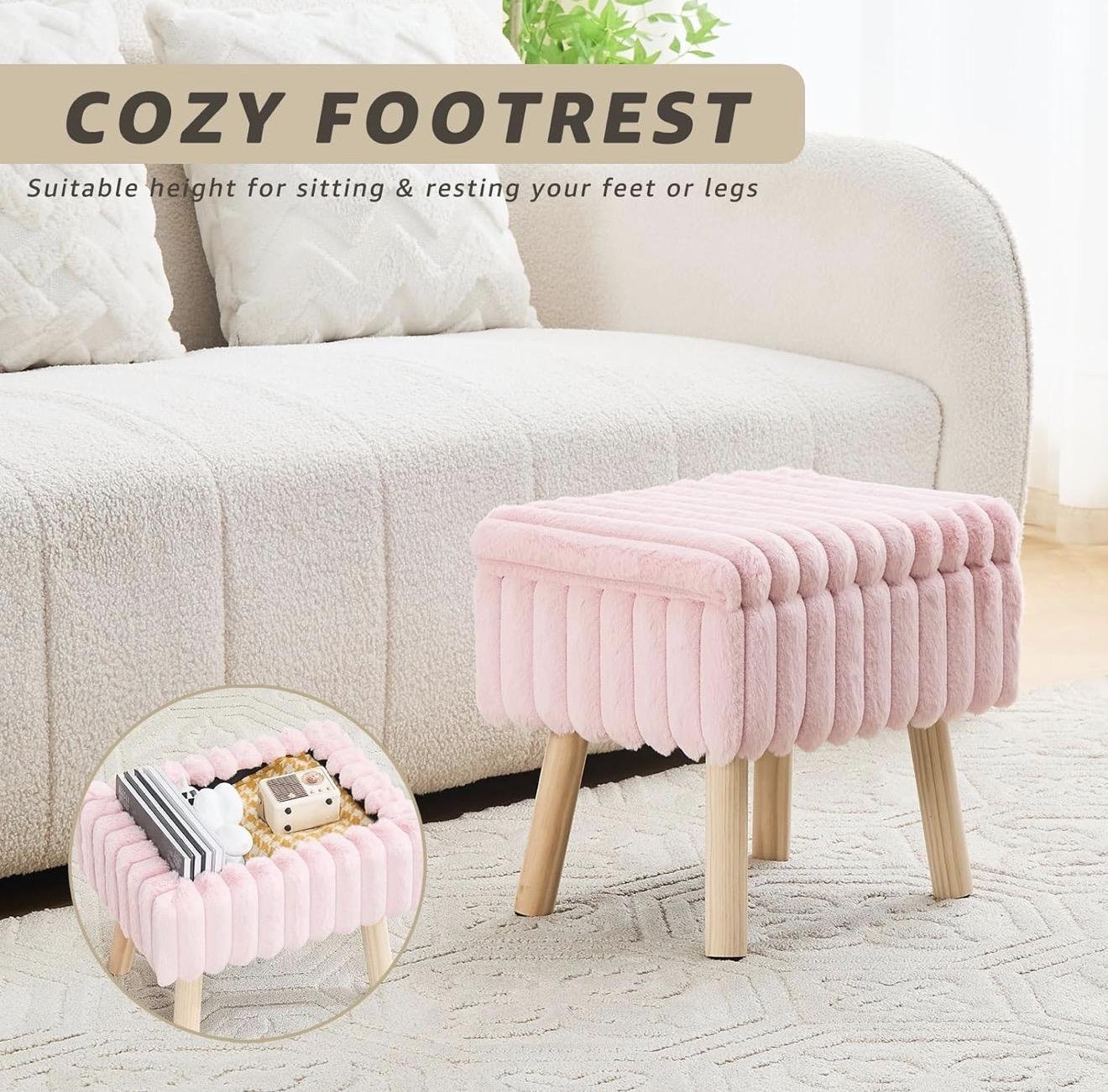Chic and space-saving, this pink faux fur storage ottoman doubles as a seat, footrest, coffee table, and storage box. With a hidden compartment and sturdy wood legs, it’s the perfect multifunctional piece for tiny homes, apartments, or any small space.
